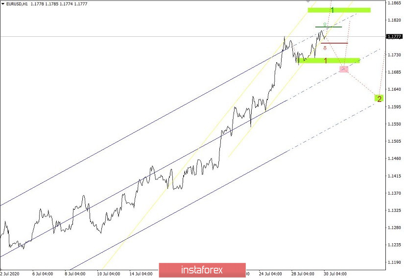 Первый сценарий рассматривает дальнейшее восходящее движение по границе желтого канала, где в случае фиксации цены выше чем 1,1800 откроется путь в сторону значения 1,1850. Фактически данный шаг приведет к изменению угла наклона синего канала.