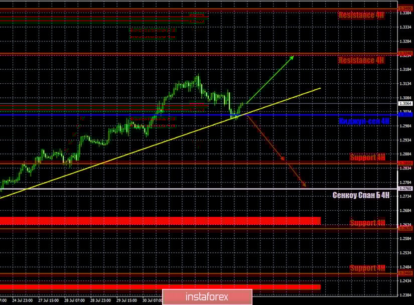 На 15-минутном таймфрейме оба канала линейной регрессии развернулись вниз в понедельник, показав, что трейдеры больше не рассматривают длинные позиции и готовы к коррекции. Новый отчет COT (Commitments of traders) по британской валюте настораживает еще сильнее предыдущего. Напомним, что прошлый отчет COT за 15-21 июля показал, что некоммерческие трейдеры открыли больше Sell-контрактов, чем Buy, тем не менее именно британский фунт продолжал расти весь отчетный период. Пятничный отчет COT показал приблизительно такую же картину. Категория трейдеров «Non-commercial», которая считается «двигателем» рынка, открыла 2,7 тысячи Sell-контрактов и закрыла (!) 8,7 тысячи Buy-контрактов. Таким образом, нетто-позиция для этой категории трейдеров еще сильнее понизилась, что означает усиление медвежьего настроя. И такие цифры отчета уже вторую неделю подряд заставляют нас задумываться о возможной смене тренда и новом длительном падении фунта, раз наиболее важная группа трейдеров все это время занимается не покупками фунта, а его продажами, но при этом растет на рынке именно британская валюта. Мы по-прежнему склоняемся к варианту, что профессиональные трейдеры готовятся к серьезному падению фунта. Вот только позволит ли им это сделать «фундамент»? Однако фундаментальный фон не является чем-то секретным, поэтому мы считаем, что профессиональные трейдеры абсолютно четко понимают, что они делают.
