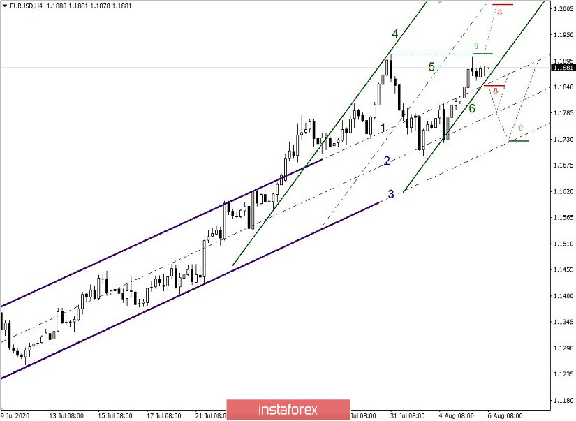 Исходя из анализа поведения цены, относительно трендовых линий, можно предположить, что в случае если линия №6 сыграет роль опоры, то восходящее развитие доведет котировку до последующей трендовой линии №5 (район 1,2000/1,2030). Наиболее оптимальная точка для входа в позиции на покупку находится выше, чем 1,1910, она отражает локальный максимум 31 июля.