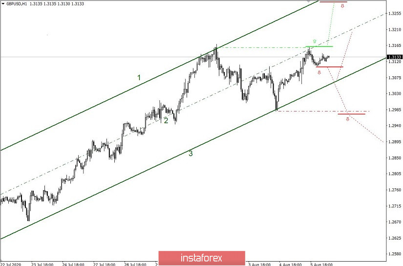 Второй вариант исходит из удержания восходящего настроя рынка, где котировке после непродолжительного колебания удается зафиксироваться выше трендовой линии №2 и локального максимум 31 июля (1,3150/1,3170), что за собой ведет к открытию позиций на покупку и ходу цены к трендовой линии №1 (район 1,3300).