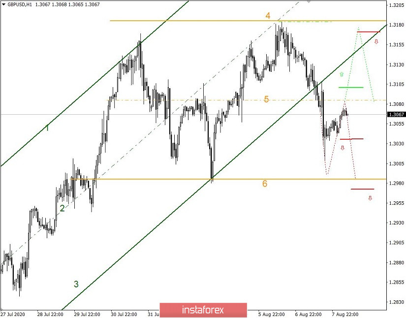 Второй сценарий исходит из пятничного нисходящего хода, на основе которого было изменено направление рынка. В данном случае отскок цены от трендовой линии №5 может вернуть котировку в пределы точки опоры 1,3000.