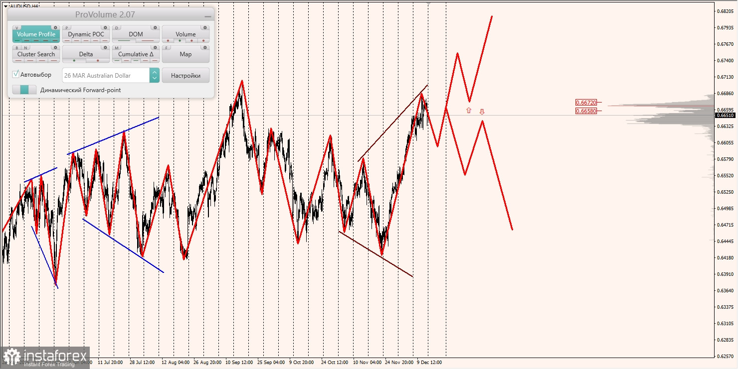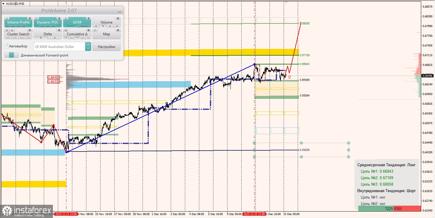Среднесрочная тенденция: в лонг. Максимальное скопление объемов среднесрочной тенденции расположено в диапазоне по котировкам 0.66320-0.66450. В настоящий момент по паре совершаются инвестиционные операции выше указанного диапазона, что говорит о силе покупателей.