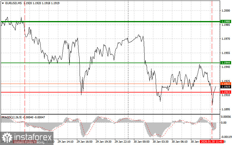 Сценарий №1: сегодня покупать евро можно при достижении цены в районе 1.1944 (зеленая линия на графике) с целью роста к уровню 1.1988. В точке 1.1988 планирую выходить из рынка, также продавать евро в обратную сторону в расчете на движение в 30-35 пунктов от точки входа. Рассчитывать на сильный рост евро можно только после слабой статистики. Важно! Перед покупкой, убедитесь в том, что индикатор MACD находится выше нулевой отметки и только начинает свой рост от нее.