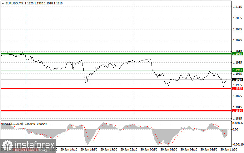 Сценарий №2: покупать евро сегодня также собираюсь в случае двух подряд тестов цены 1.1895 в момент, когда индикатор MACD будет находиться в области перепроданности. Это ограничит нисходящий потенциал пары и приведет к обратному развороту рынка вверх. Можно ожидать рост к противоположным уровням 1.1944 и 1.1988.