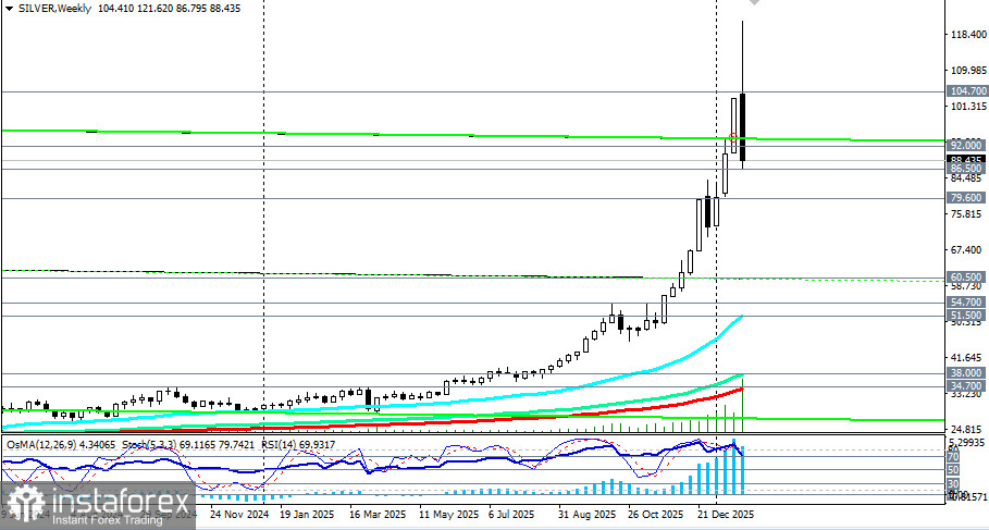 За два дня волатильность в паре XAU/USD составила примерно 17% (или 8000 пунктов / 800 долларов), когда цена, достигнув в четверг рекордного максимума вблизи отметки 5600.00, затем перешла к резкому снижению и в пятницу обо рушилась к отметке 4800.00 (на момент публикации статьи). Продавцы неоднократно тестировали уровень 5000.00 и все-таки к концу дня смогли его взять, опустив цену еще примерно на 2000 пунктов (200 долларов). Всего же цена потеряла более 14% от достигнутого в четверг рекордного максимума, опустившись к 6-дневным минимумам и перейдя на негативную сторону по итогам этой недели.