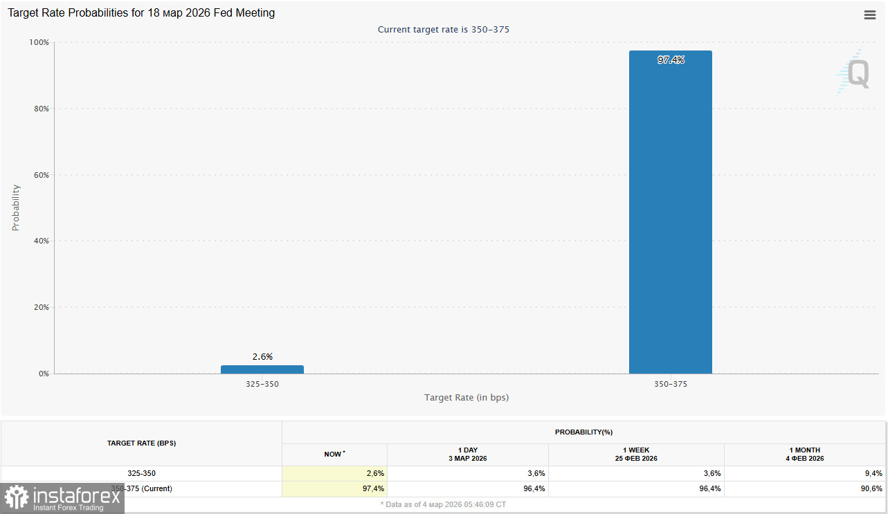 Рост цен на энергоносители кардинально меняет ожидания рынка относительно монетарной политики. Инструмент CME FedWatch показывает 97% вероятности сохранения ставки на мартовском заседании.