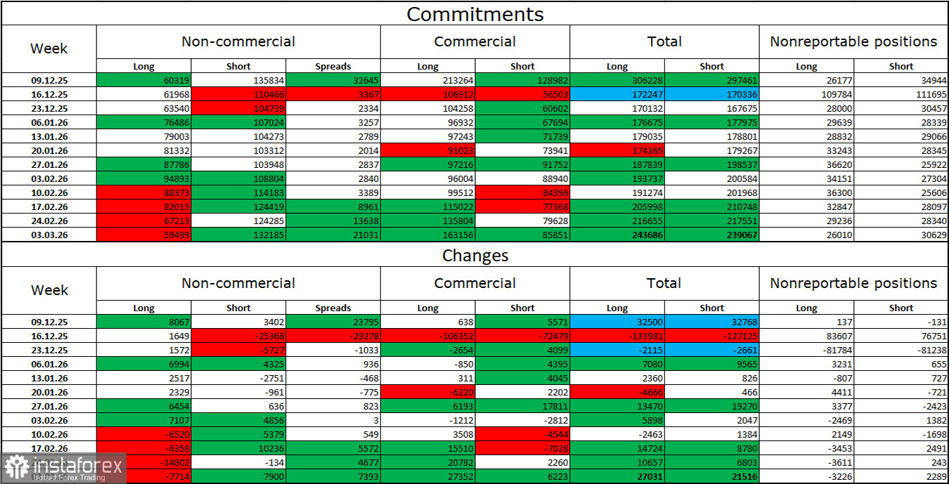 Настроение категории трейдеров «Non-commercial» за последнюю отчетную неделю стало более «медвежьим», что в текущих обстоятельствах уже не выглядит случайностью. Количество Long-контрактов на руках спекулянтов сократилось на 7714 единиц, а количество Short – выросло на 7900 единиц. Разрыв между количеством Long и Short-контрактов сейчас фактически следующий: 59 тысяч против 132 тысяч. В последние месяцы чаще доминируют медведи, но ситуация с контрактами по евровалюте прямо противоположная. В «медвежий» тренд по британцу я по-прежнему не верю, но теперь все будет зависеть не от экономических показателей, торговой политики Трампа, а от длительности и масштаба войны на Ближнем Востоке.