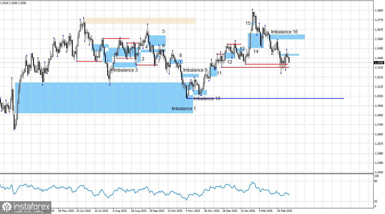 Отмечу, что падение британца в последние несколько недель получилось настолько сильным из-за неудачного стечения обстоятельств. Если бы Дональд Трамп не обещал через день атаковать Иран, не отправлял военные корабли в Персидский залив, а затем не начал войну, мы бы вряд ли увидели такой сильный рост доллара. Я считаю, что это падение может завершиться также неожиданно, как и началось. Однако в данное время оно продолжается, а цена получила реакцию на последний «медвежий» имбаланс. Прогнозировать падение британца до конкретных уровней при текущем нестабильном информационном фоне я не берусь.