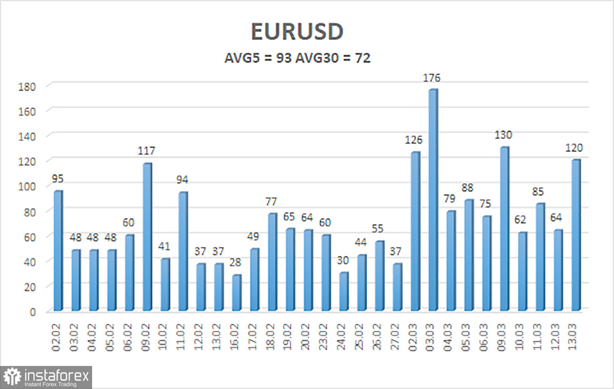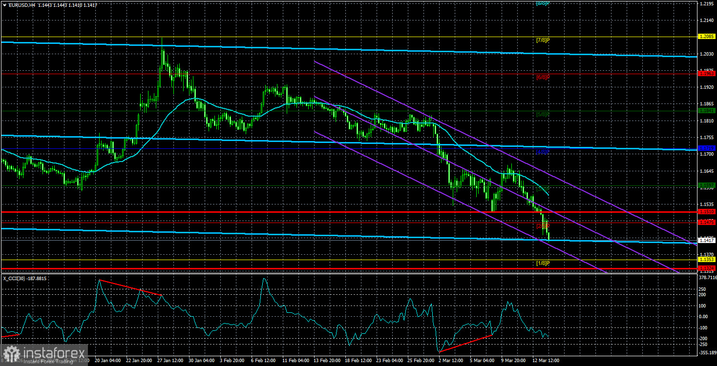 Средняя волатильность валютной пары EUR/USD за последние 5 торговых дней по состоянию на 16 марта составляет 93 пункта и характеризуется, как «средняя». Мы ожидаем движение пары между уровнями 1,1324 и 1,1510 в понедельник. Старший канал линейной регрессии развернулся вбок, что указывает на разворот тренда. Индикатор CCI вновь заходил в область перепроданности и сформировал «бычью» дивергенцию, но даже технические сигналы сейчас не играют никакой роли.