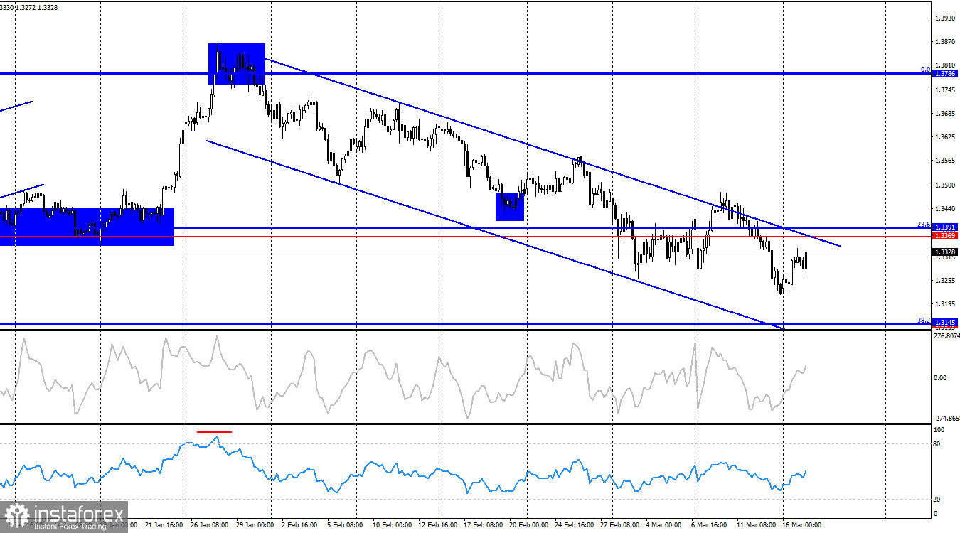 Информационный фон в понедельник никакого интереса у трейдеров не вызвал, но вялые сообщение о возможной разблокировке Ормузского пролива и временная пауза в наступлении медведей позволили британцу приподняться с колен. Теперь перед трейдерами стоит сопротивление 1,3341 – 1,3352, и именно оно покажет, есть ли силы и желание у быков. Небольшая коррекция может быть случайностью, а вот сильные движения случайностью не бывают практически никогда. Уже завтра вечером ФРС проведет второе заседание в 2026 году. Рынок не ожидает, что параметры ДКП изменятся, Дональд Трамп по-прежнему требуется смягчения, ВВП США замедлился в четвертом квартале до 0,7%, рынок труда продолжает «болеть», инфляция в ближайшее время может значительно ускориться. Таким образом, встреча управляющих ФРС на этой неделе может стать очень интересной. В частности, трейдеры узнают, какая из проблем волнует комитет FOMC больше: потенциальный рост инфляции или слабость рынка труда/экономики США? На мой взгляд, пока инфляция не начала расти, ФРС не будет предпринимать никаких действий. Если индекс потребительских цен начнет ускоряться, тогда следующее снижение процентной ставки мы увидим очень нескоро. Таким образом, сначала нужно понять, как будет реагировать инфляция на рост нефтяных котировок и войну в Иране. Однако Джером Пауэлл и компания также не могут просто закрыть глаза на слабеющую экономику и растущую безработицу. Таким образом, сюрпризы завтра вечером возможны.