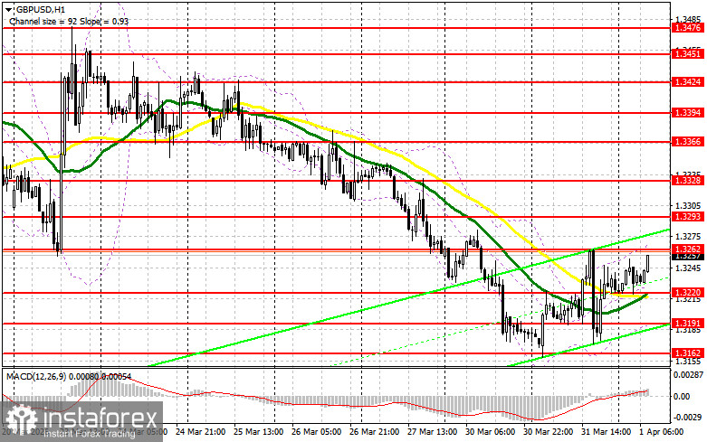 Продавцы вчера сделали все, что от них зависело, но рынок ни мог не отреагировать на заявления Трампа о том, что война с Ираном подходит к своему завершению. В случае дальнейшего восстановления GBP/USD в первой половине дня после хороших данных, первого проявления медведей ожидаю увидеть в районе сопротивления 1.3262. Формирование там ложного пробоя станет поводом для открытия коротких позиций с возвратом на 1.3220, где проходят средние скользящие, играющие на стороне быков. Прорыв и обратный тест снизу вверх этого диапазона нанесут более крупный удар по позициям покупателей, приведя к сносу стоп-приказов и открыв путь к минимуму 1.3191. Там ожидаю уже более активного проявления покупателей. Самой дальней целью выступит область 1.3162, где буду фиксировать прибыль. При варианте роста GBP/USD и отсутствия активности на 1.3262, покупатели попытаются добиться нового крупного рыка вверх, получив шанс на восстановление в район 1.3293. Открывать там короткие позиции собираюсь также лишь на ложном пробое. При отсутствии движения вниз и там я буду продавать GBP/USD сразу на отскок от 1.3328, но лишь в расчете на коррекцию пары вниз на 30-35 пунктов внутри дня.