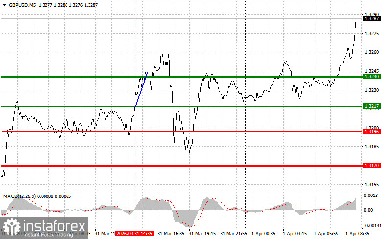 Тест цены 1.3217 пришелся на момент, индикатор MACD только начинал движение вверх от нулевой отметки, что стало подтверждением правильной точки входа на покупку фунта. В результате пара выросла в район целевого уровня 1.3240.