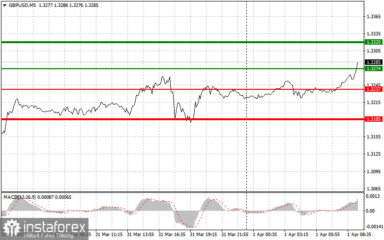 Сценарий №2: продавать фунт сегодня также планирую в случае двух подряд тестов цены 1.3274 в момент, когда индикатор MACD будет находиться в области перекупленности. Это ограничит восходящий потенциал пары и приведет к обратному развороту рынка вниз. Можно ожидать снижения к противоположному уровню 1.3237 и 1.3185.