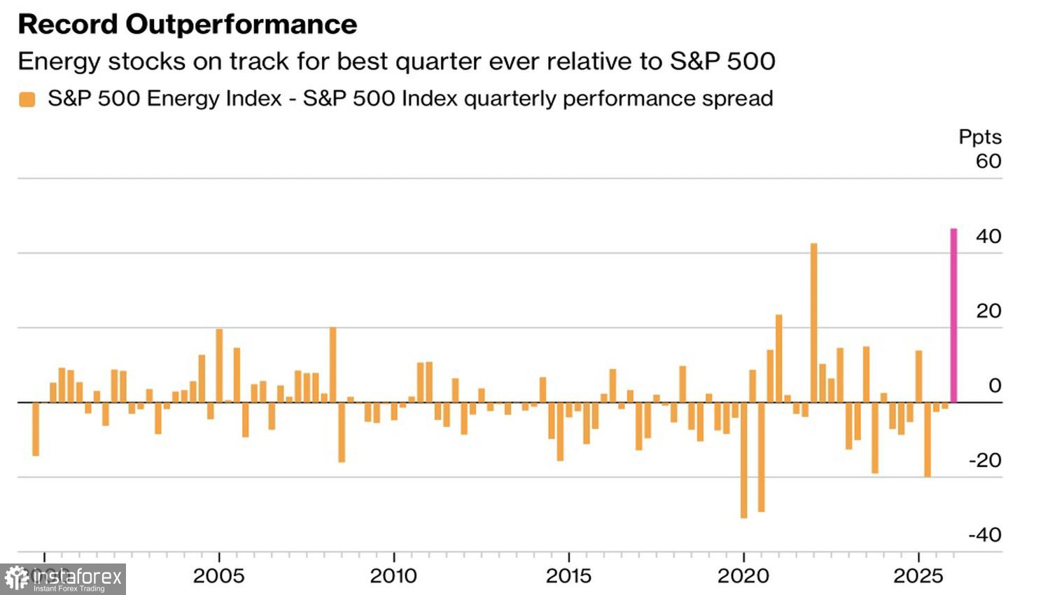 То же самое происходит на рынке акций. Энергетика стала главным бенефициаром вооруженного конфликта на Ближнем Востоке. Это единственный из 11 секторов S&P 500, который закрыл март в зеленой зоне. Его расхождение с широким фондовым индексом оказалось рекордным.