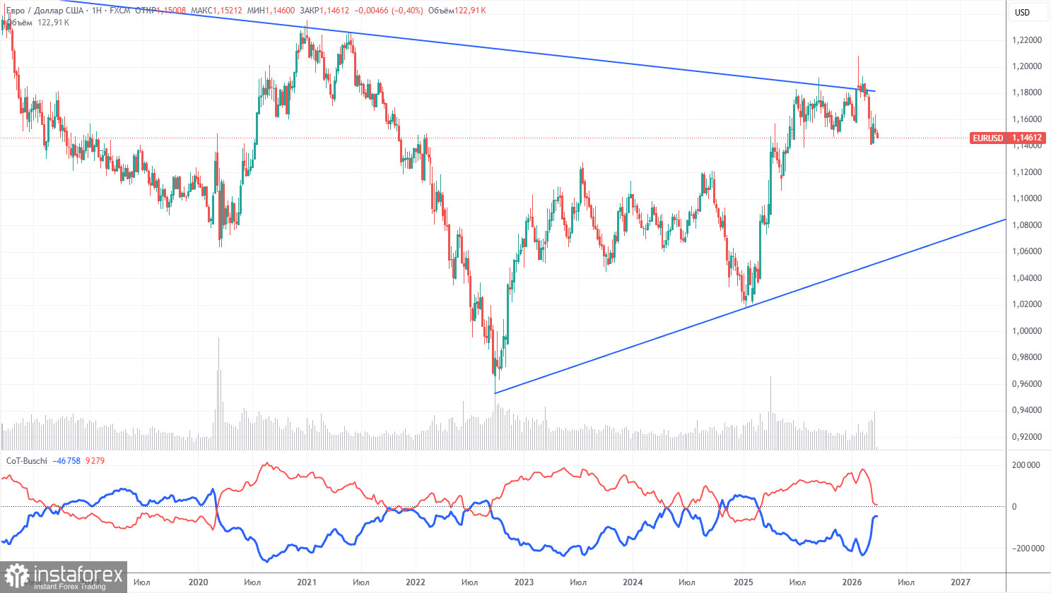 Мы по-прежнему не видим никаких фундаментальных факторов для укрепления европейской валюты. Зато остается достаточное количество факторов для падения американской. Война на Ближнем Востоке сделала доллар на время супер-привлекательным, но когда у этого фактора истечет срок годности, все может вернуться на круги своя. В долгосрочном плане евро может падать хоть до уровня 1,06(линия тренда), но восходящий тренд все равно останется актуальным.