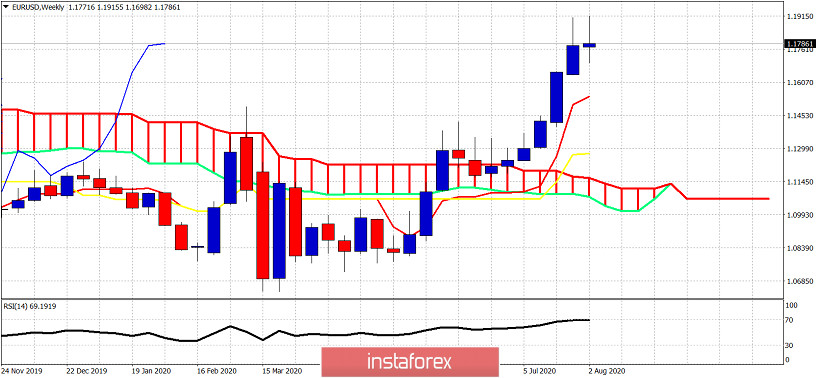 On a daily basis, Friday's candlestick has closed below the tenkan-sen (red line indicator). This is a weak sell signal or better a warning signal of more downside to come. Technically support is now found at 1.17. Staying below the tenkan-sen will push price towards the kijun-sen at 1.1565. So this is our next downside target if price breaks below 1.17.*El análisis de mercado publicado aquí tiene la finalidad de incrementar su conocimiento, más no darle instrucciones para realizar una operación.