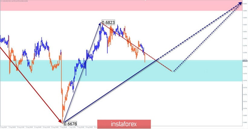 En el gráfico horario de "Aussie", la onda ascendente del 7 de agosto tiene un nivel de onda alto, alegando que comienza un modelo de onda más grande. Se espera al menos una corrección completa de la onda de tendencia anterior del 19 de julio. Dentro del marco de la estructura que ha comenzado, se está desarrollando una reversión en los últimos días.