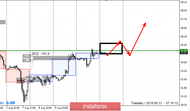 Un modelo alternativo se desarrollará si un análisis repetido al nivel de $55 da lugar a la formación de un patrón de falsa ruptura. En este caso, deben cerrar todas las compras y abrir una posición corta. El primer objetivo de la reducción será 1/2 WCZ de 53.35-53.17.