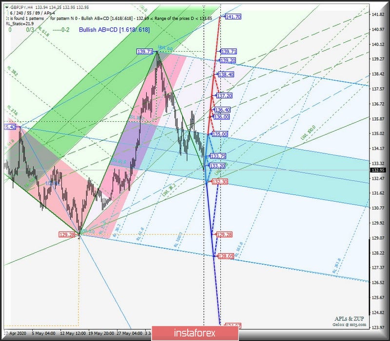 El desarrollo del movimiento entre instrumentos GBP/JPY a partir del 19 de junio de 2020 también estará determinado por el desarrollo y la dirección de la ruptura de los límites de la zona de equilibrio (135.00-133.75-132.30) de las horquillas de escala operativa Minuette: dentro del gráfico animado, se presenta el marcado de movimiento dentro de esta zona de equilibrio.