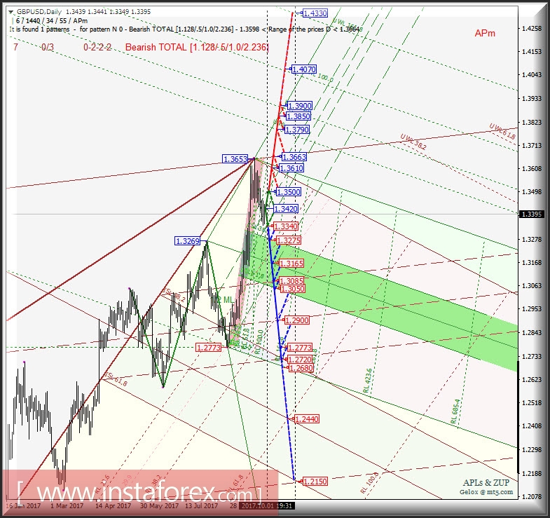 Развитие движения цены инструмента (GBP/USD) в октябре-ноябре 2017 г. будет обусловлено отработкой границ канала 1/2 Median Line (1.3500 <-> 1.3420 <-> 1.3340) вил операционного масштаба Minute.