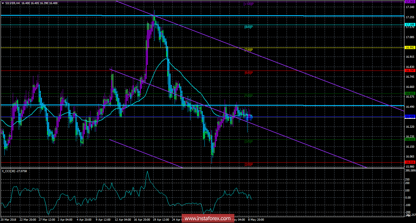 Исходя из анализа серебра 8 мая следует, что цена так и не сумела продолжить движение вверх и закрепилась ниже скользящей средней линии. Старший канал развернулся вбок, что свидетельствует о возможном изменении направления глобального тренда на восходящее. Младший канал направлен вниз, что означает нисходящую тенденцию в краткосрочном плане. В данный момент цена закрепилась ниже мувинга и ниже уровня Мюррея «4/8», что делает более вероятным продолжение нисходящего движения. Первой целью для движения вниз сейчас выступает уровень Мюррея «3/8» - 16,211. Если цена преодолеет первый таргет, то следующей актуальной целью для движения вниз будет выступать уровень Мюррея «2/8» - 16,016. Скользящая средняя линия направлена вбок, а цена располагается ниже нее, что сигнализирует о нисходящем уклоне инструмента. Хайкен Аши окрасил последние бары в фиолетовый цвет, что сигнализирует о локальном восходящем движении. Окрас 1-2 баров в голубой цвет будет означать возможное возобновление движения вниз, а sell-позиции станут вновь доступными для открытия. Длинные позиции можно будет рассматривать не ранее закрепления цены выше мувинга и разворота наверх любого канала. Индикатор CCI находится около уровня 0, что сигнализирует об отсутствии любой перекупленности и перепроданности инструмента.