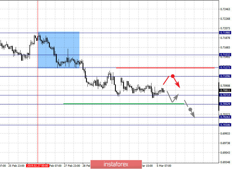 Краткосрочное восходящее движение возможно в коридоре 0.7109 – 0.7127, пробой последнего значения приведет к углубленной коррекции, здесь цель – 0.7153, этот уровень является ключевой поддержкой для нисходящей структуры.