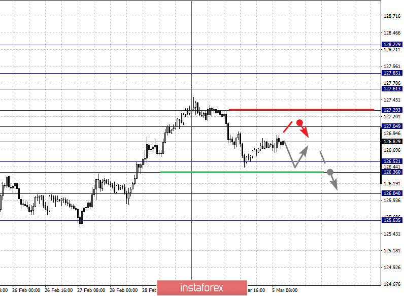 Краткосрочное восходящее движение ожидаем в коридоре 127.04 – 127.29, отсюда высока вероятность разворота книзу, пробой уровня 127.30 продолжит развитие восходящей тенденции в масштабе Н1, в данном случае первая потенциальная цель – 127.61.