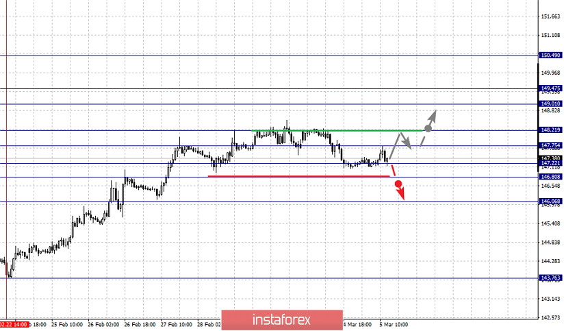 Краткосрочное нисходящее движение возможно в коридоре 147.22 – 146.80, пробой последнего значения приведет к углубленной коррекции, здесь цель – 146.06, этот уровень является ключевой поддержкой для верха.