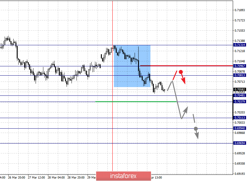 По паре Австралийский доллар/Доллар ключевыми уровнями в масштабе Н1 являются: 0.7131, 0.7096, 0.7081, 0.7048, 0.7037, 0.7011, 0.6994 и 0.6969. Здесь цена оформила локальную структуру для низа от 1 апреля. Продолжения движения книзу ожидаем после прохода ценой шумового диапазона 0.7048 – 0.7037, в данном случае цель – 0.7011, в коридоре 0.7011 – 0.6994 краткосрочное нисходящее движение, а также консолидация. Потенциальным значением для низа считаем уровень 0.6969, по достижении которого ожидаем откат кверху.