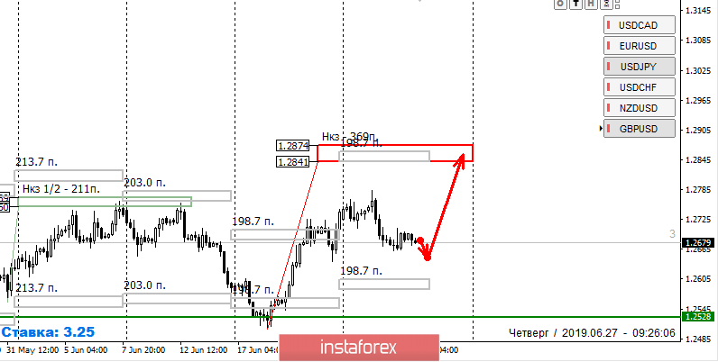 Альтернативной моделью станет рост после формирования паттерна "ложный пробой" вчерашнего минимума. Если это произойдет, то первой целью роста станет максимум текущей недели. Основной целью выступит недельная КЗ 1.2874-1.2841, которая совпадает со средним ходом недели.