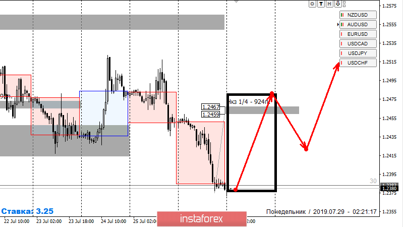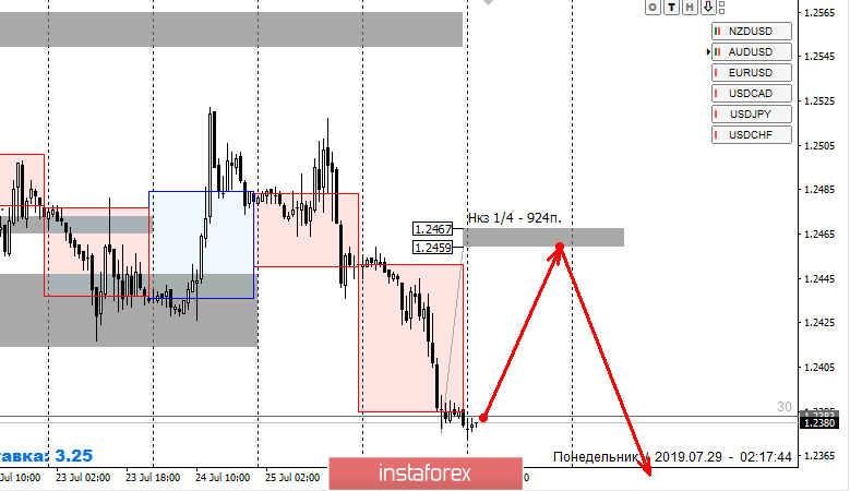 Открытие торгов текущей недели произошло на уровне месячного минимума, что говорит о нисходящем приоритете. Удержание продаж, открытых ранее, является основой торгового плана. Любой рост необходимо воспринимать как коррекционный и использовать для повторных входов в короткую позицию. Ближайшим сопротивлением выступает НКЗ 1/4 1.2467-1.2459, тест которой обязывает рассматривать паттерны на продажу.