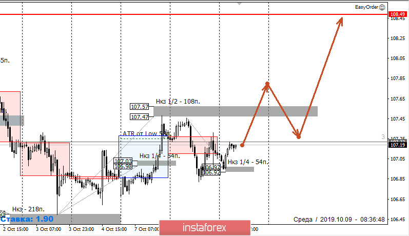 Вчерашнее снижение пары привело к тесту НКЗ 1/4 106.97-106.92. Удержание цены выше этой зоны указывает на набор позиции в обе стороны. Сопротивлением выступает НКЗ 1/2 107.57-107.47. Ее тест позволит вновь искать паттерн на продажу инструмента. Целью нисходящего движения остается октябрьский минимум.