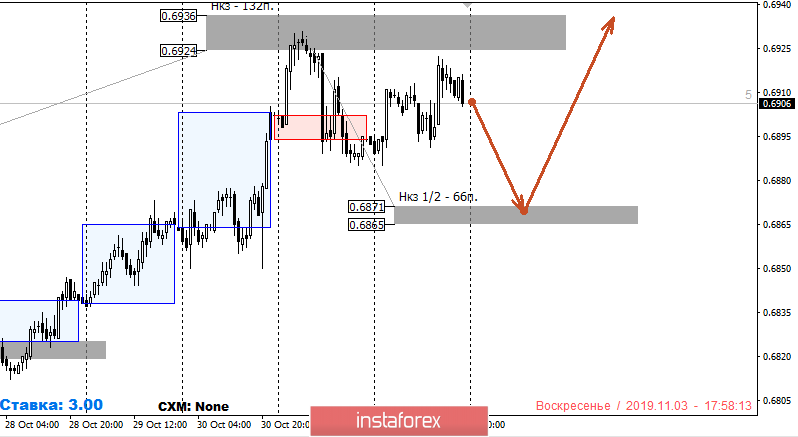В четверг пара протестировала недельную КЗ 0.6936-0.6924, что привело к остановке роста. Определяющей поддержкой выступает НКЗ 1/2 0.6871-0.6865. Пока пара торгуется выше указанной зоны, бычье движение останется импульсом. Покупки при тесте НКЗ 1/2 являются выгодными, так как вероятность обновления ноябрьского максимума составляет 75%.