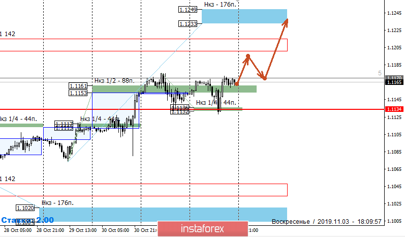 Определяющим сопротивлением в конце прошлой недели выступала НКЗ 1/2 1.1161-1.1153. Закрытие торгов пятницы произошло выше этой зоны. Это открывает возможности для дальнейшего роста пары к недельной КЗ 1.1249-1.1233. Покупки Евро выходят на первый план, однако выгодные цены располагаются чуть ниже уровня 1.1134.