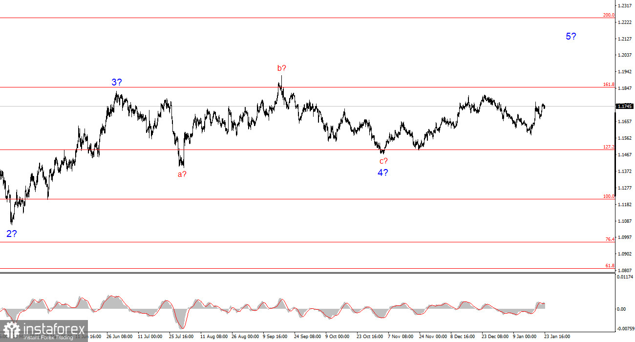 Волновая разметка 4-часового графика для инструмента EUR/USD остается без изменений. Об отмене повышательного участка тренда, который берет свое начало в январе прошлого года, речи не идет, но волновая структура, начиная с 1 июля 2025 года, приняла сложный, протяженный, коррекционный вид. На мой взгляд, инструмент завершил построение коррекционной волны 4, которая имеет нестандартную внутреннюю разметку. Внутри этой волны мы наблюдали исключительно коррекционные структуры, поэтому сомнений в коррекционном характере этой волны не возникает никаких.