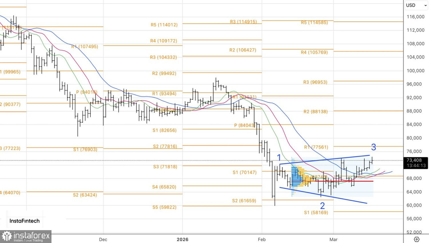 Технически на дневном графике BTC/USD пин-бар с длинной верхней тенью не был активирован, а котировки вернулись к его вершине. Это свидетельствует о слабости «медведей» и дает основание для формирования лонгов. По крайней мере, пока биткойн торгуется выше 70150.