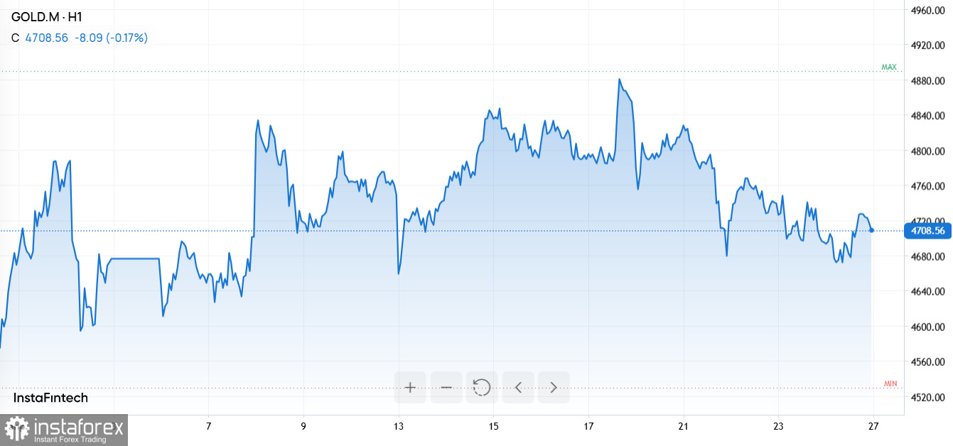 В четверг золото опустилось ниже отметки $4 700 за унцию и в пятницу удерживалось рядом с этим уровнем. Давление на котировки оказывали два фактора: укрепление доллара США и ослабление ожиданий скорого снижения ставок ФРС. Геополитическая напряженность на Ближнем Востоке продолжала поддерживать "безопасные" настроения, но полностью компенсировать негатив для драгметалла не смогла.