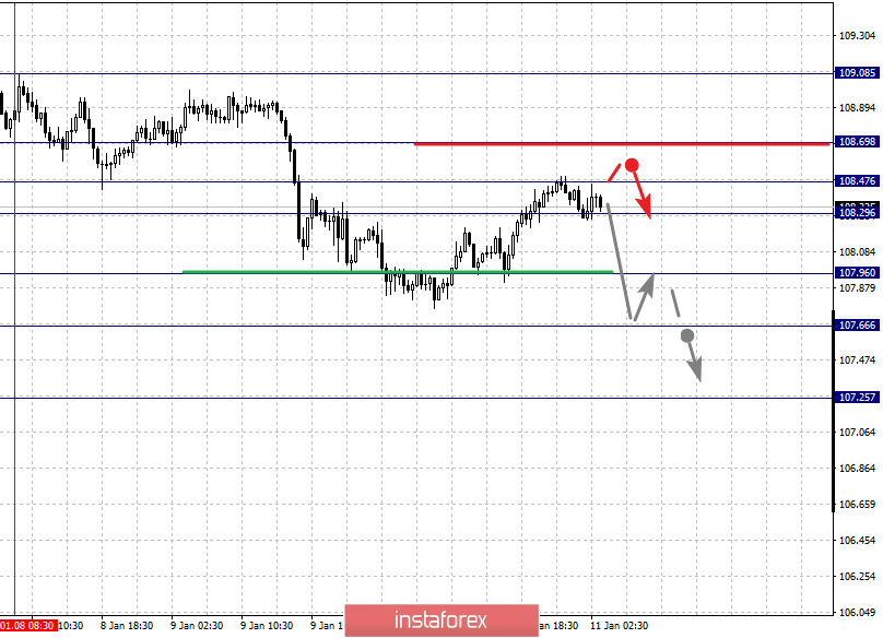 Краткосрочное восходящее движение возможно в коридоре 108.29 – 108.47, пробой последнего значения приведет к затяжной коррекции, здесь цель – 108.69, этот уровень является ключевой поддержкой для нисходящей структуры от 8 января.