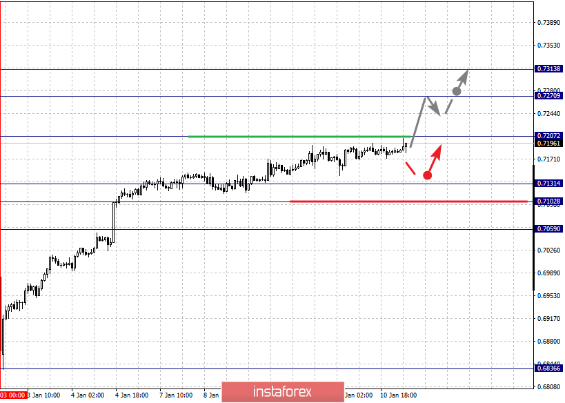 Краткосрочное нисходящее движение возможно в коридоре 0.7131 – 0.7102, пробой последнего значения приведет к затяжной коррекции, здесь цель – 0.7059, этот уровень является ключевой поддержкой для восходящей структуры.