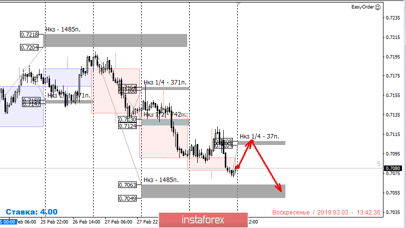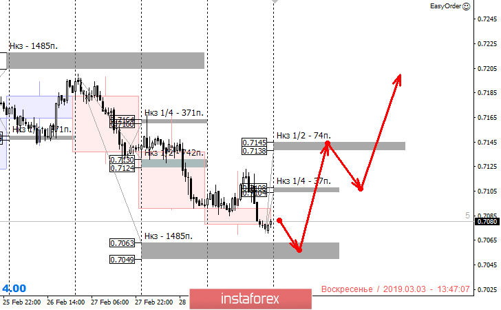 При построении торгового плана на понедельник требуется учитывать тот факт, что пара не достигла недельной КЗ 0.7063-0.7049. Когда это произойдет, нисходящее движение можно будет считать реализованным. Это позволит зафиксировать большую часть профита, а остальную позицию перевести в безубыток. Если первым движением будет усилении курса австралийского доллара, то можно будет получить выгодные цены на продажу инструмента при тестировании одной из зон сопротивления.