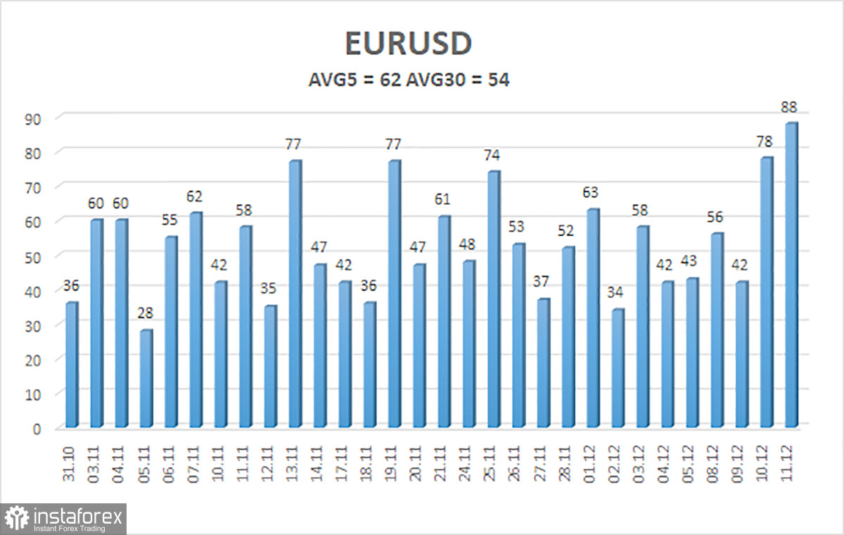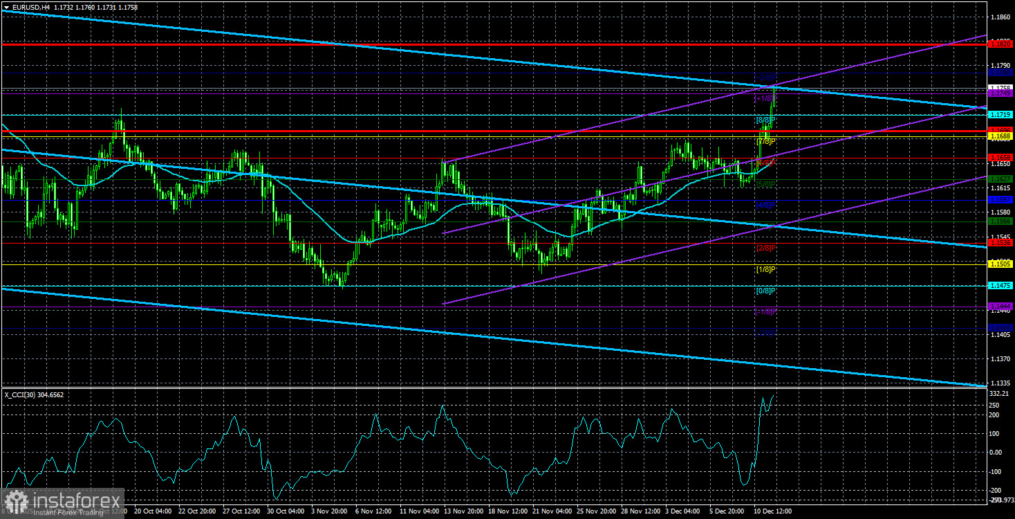 Средняя волатильность валютной пары EUR/USD за последние 5 торговых дней по состоянию на 12 декабря составляет 62 пункта и характеризуется, как «средняя». Мы ожидаем движение пары между уровнями 1,1696 и 1,1820 в пятницу. Старший канал линейной регрессии направлен вниз, сигнализируя о нисходящей тенденции, но по факту продолжается флэт на дневном ТФ. Индикатор CCI заходил в октябре в область перепроданности дважды(!!!), что может спровоцировать новый виток восходящего тренда 2025 года.