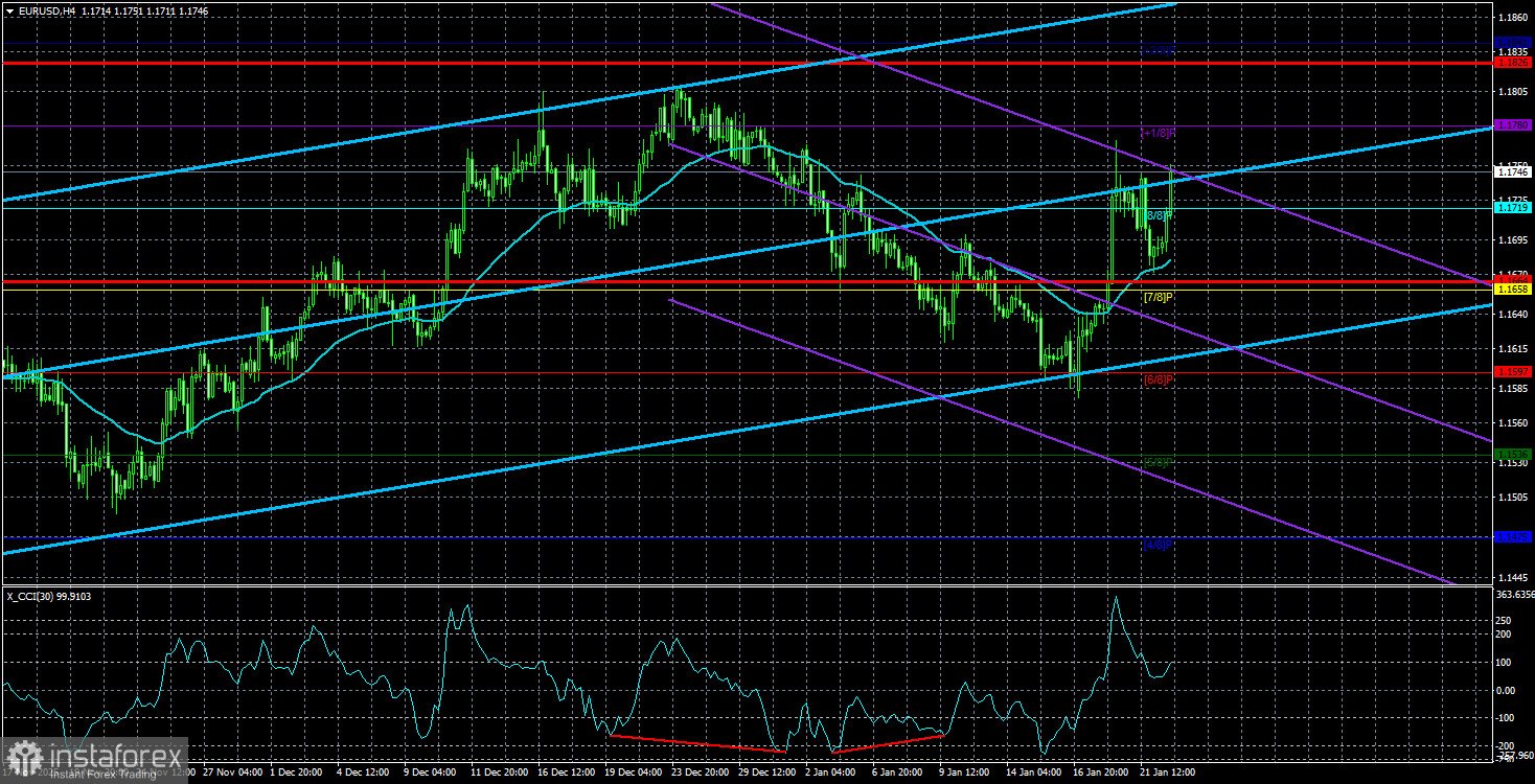 Средняя волатильность валютной пары EUR/USD за последние 5 торговых дней по состоянию на 23 января составляет 81 пункт и характеризуется, как «средняя». Мы ожидаем движение пары между уровнями 1,1664 и 1,1826 в пятницу. Старший канал линейной регрессии направлен вверх, но по факту все еще продолжается флэт на дневном ТФ. Индикатор CCI зашел в область перепроданности на этой неделе, что указывает на нисходящий откат, который уже может быть завершен. Ключевым моментом остается флэт на дневном ТФ.