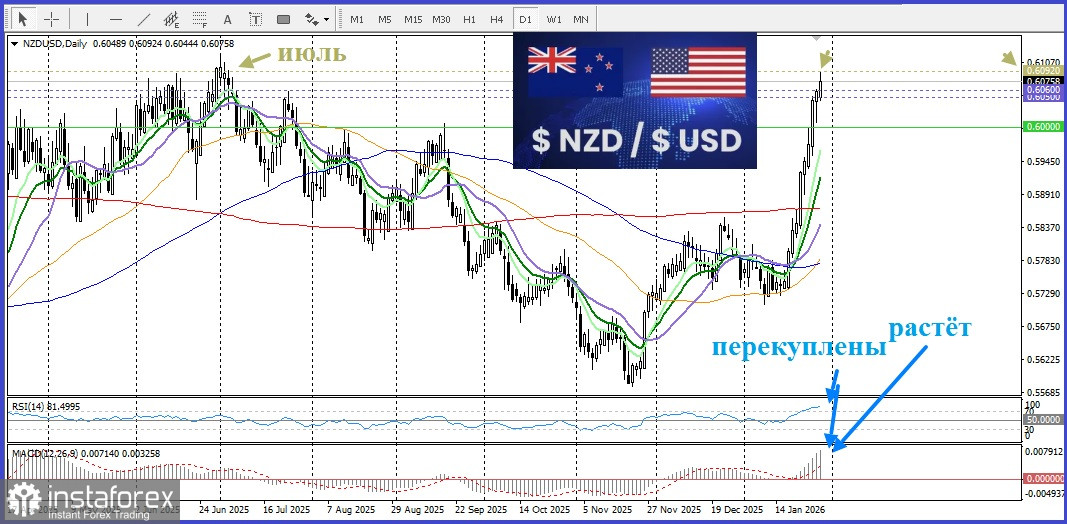 Джером Пауэлл, глава ФРС, указал, что монетарная политика лишена предустановленного плана, а грядущие шаги будут определяться исключительно входящими данными, что рынки расценили как умеренно жесткий сигнал. При этом данные по рынку труда США демонстрируют снижение первичных заявок на пособие по безработице до 209 тысяч за прошлую неделю и сокращение продолжающихся заявок до 1,827 миллиона - минимума с сентября 2024 года, что подпирает доллар США, и сдерживает размах роста пары NZD/USD.