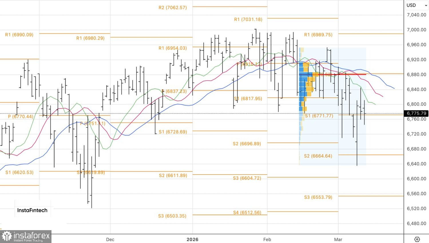 Технически на дневном графике S&P 500 имела место попытка «медведей» отыграть пин-бар. Однако борьба с «быками» по-прежнему ведется за пивот-уровень 6770. Падение котировок ниже данной поддержки станет основанием для продаж. Напротив, закрепление широкого фондового индекса выше – повод для формирования длинных позиций.