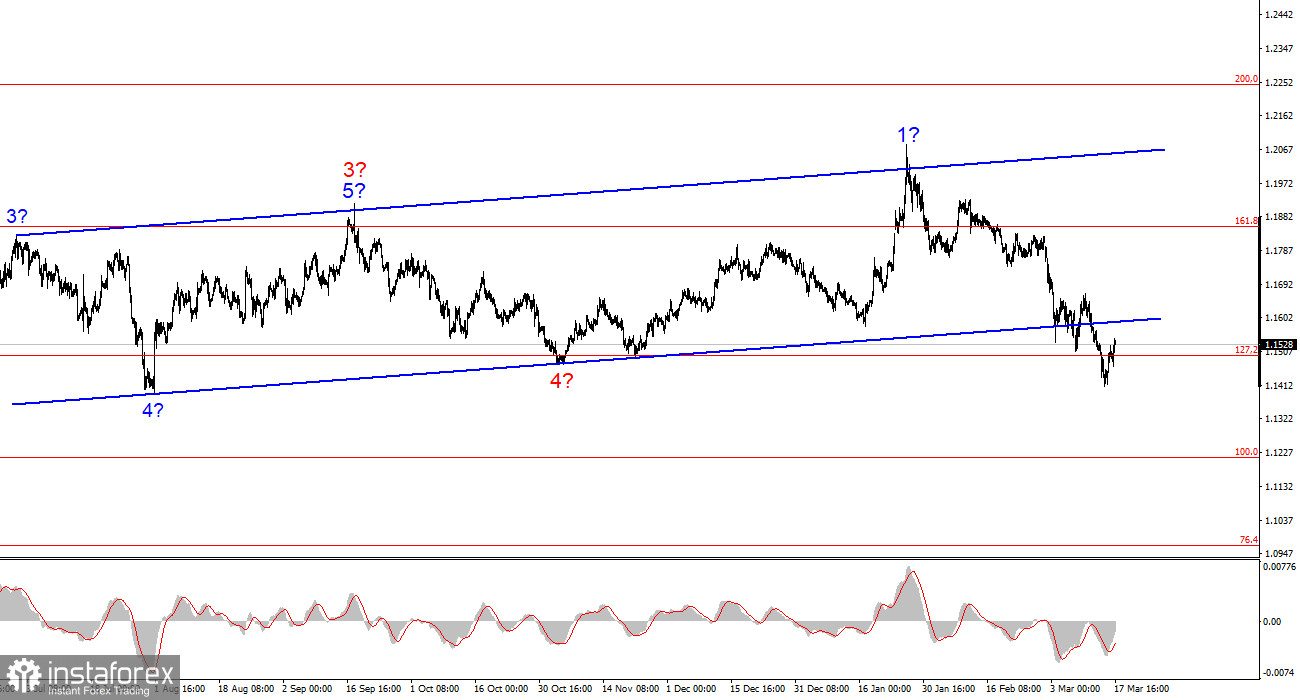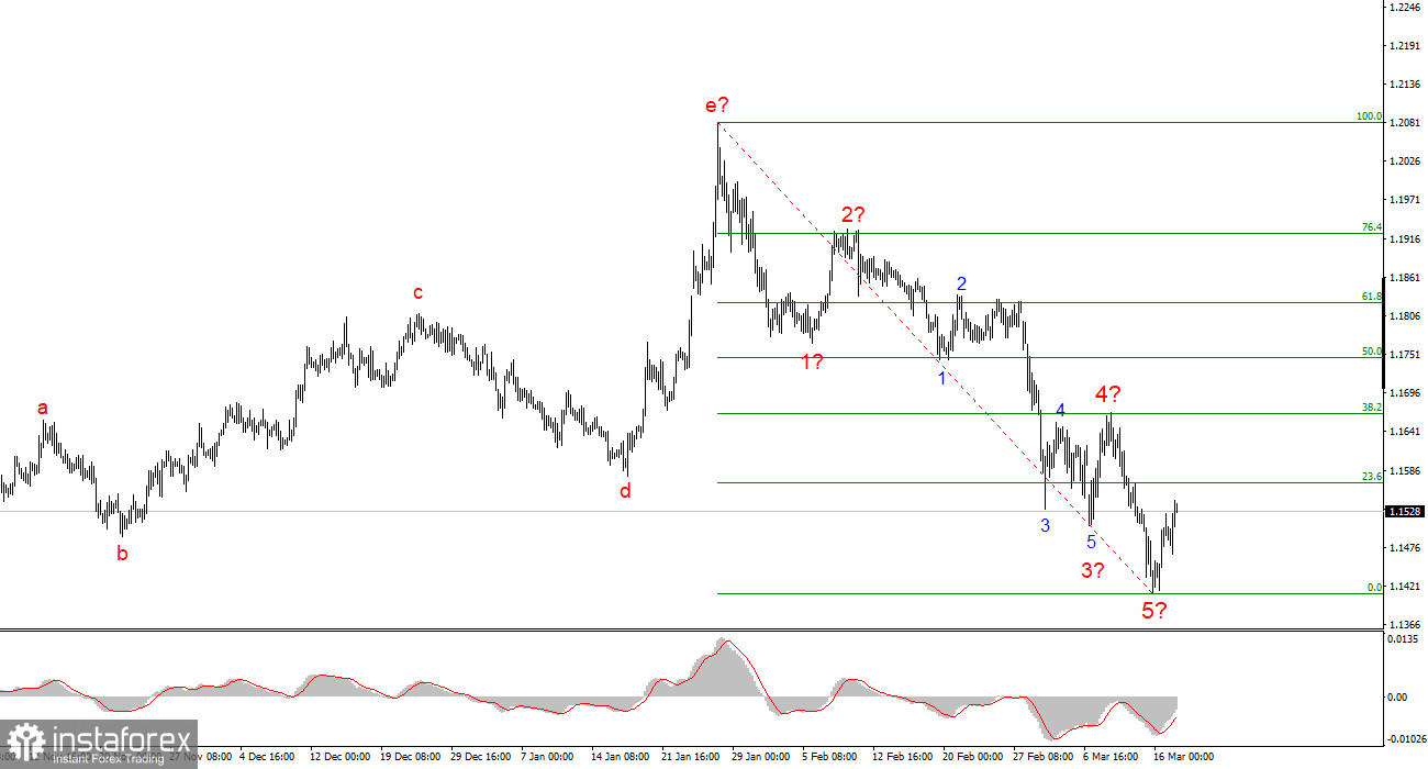 На картинке выше я могу выделить классическую пятиволновую импульсную структуру волн с удлинением в третьей волне. Если это действительно так, то построение этой структуры завершено, а нас ожидает построение коррекционного набора минимум на три волны. Следовательно, в ближайшее время стоит ожидать повышения котировок инструмента, но уже в рамках коррекции относительно последнего участка тренда. Пока что последние волновые структуры очень плохо вписываются в старшую разметку, но со временем ситуация должна проясниться. В ближайшее время можно ожидать восстановления европейской валюты к отметкам 1,1568 и 1,1666.